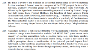 En este sentido, el laudo enfatizó que la aprobación del artículo 10 no vulneró los principios de legalidad ni de buena fe, ya que la FIFA actuó dentro de su marco competencial y en consonancia con los estándares internacionales de gobernanza deportiva. El tribunal consideró además que los clubes no podían alegar sorpresa o falta de previsibilidad, dado que el debate sobre la multipropiedad y los conflictos de interés en competiciones internacionales era ampliamente conocido y discutido desde años anteriores.